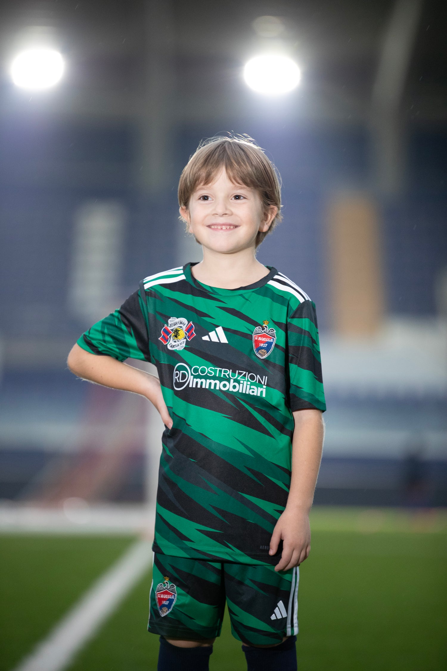 T-shirt da gara adidas terza muta nero verde del l'aquila 1927.sul petto a sinistra lo stemma ricamato della squadra, sulla destra quello della propria tifoseria r.b.e. 100% poliestere